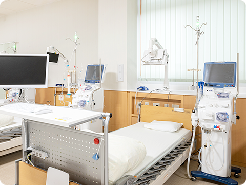 インフルエンザやCOVID-19などの飛沫感染や飛沫感染が疑われる場合は、隔離室で透析をおこないます。