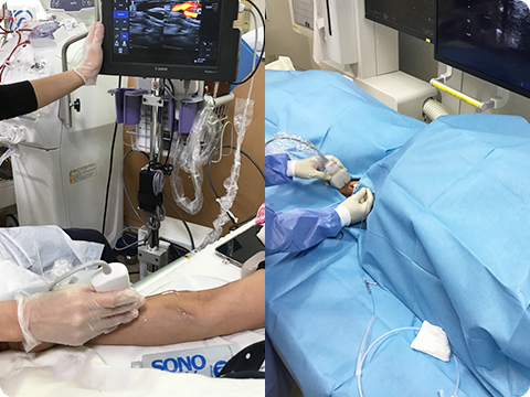 大量の血液を体外に取り出す必要があるため動脈と静脈を繋ぎ合わせる”シャント”という手術や、動脈を皮膚のすぐ下に持ち上げる”表在化”という手術を行います。