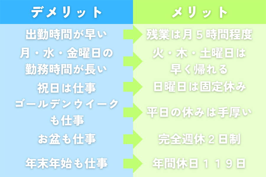 年間休日119日(月10日休み/2月は8日休み/5月は11日休み)